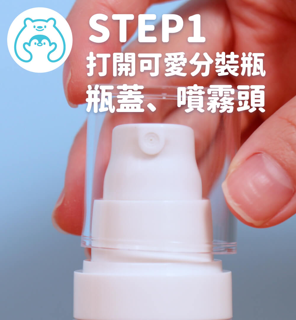 步驟1.打開分裝噴霧瓶的瓶蓋、噴霧頭。