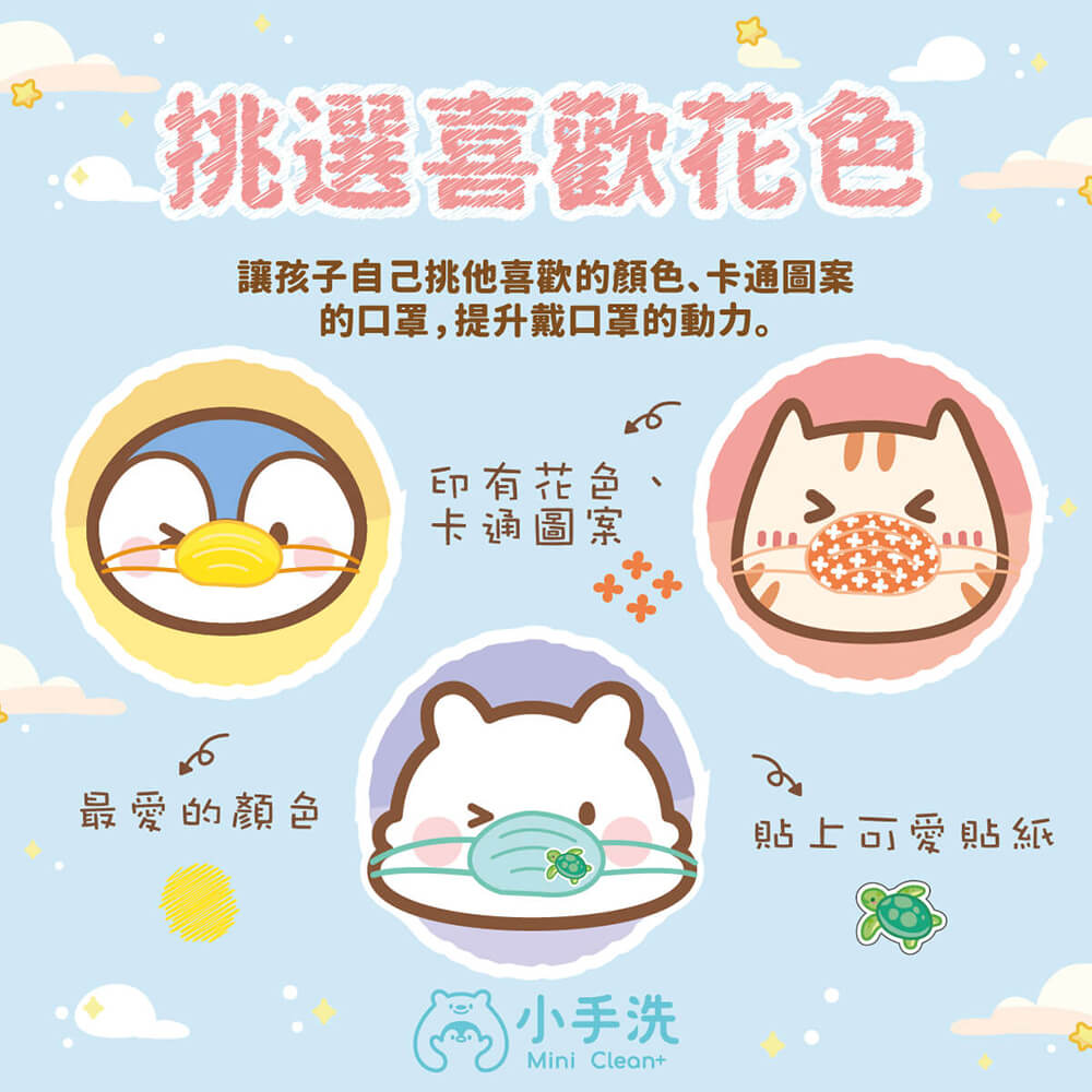 爸爸媽媽們可讓孩子自己挑他喜歡的顏色、卡通圖案的口罩。