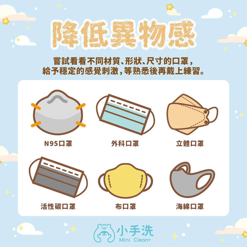 對於觸覺比較敏感的孩子,可能會對口罩的形狀、材質產生嫌惡、排斥😱