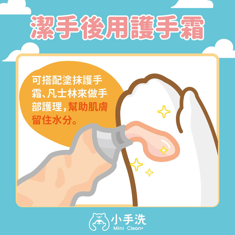 而在消毒完後,可搭配塗抹護手霜、凡士林來做手部護理