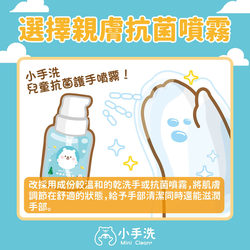針對孩子頻繁消毒、噴酒精,隨之而來的乾澀發癢、敏感脫皮的情況,