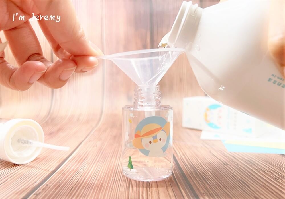 架好後,緩緩將液體倒入萬用瓶中。
