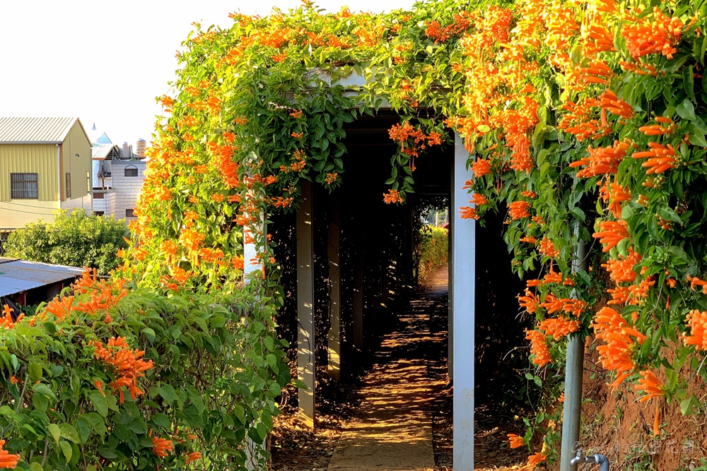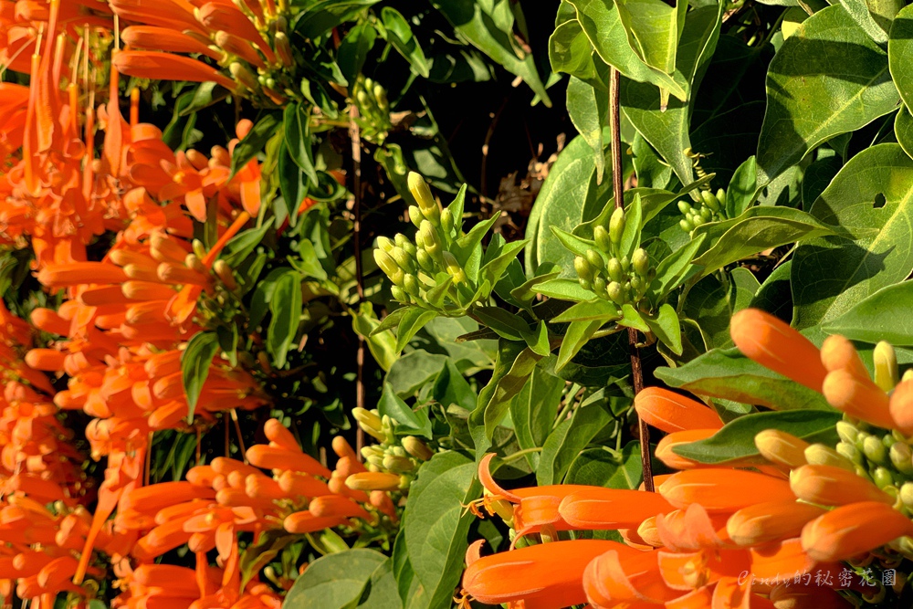 這裡也是主要的賞花處,走在步道上,綠色藤蔓及橘色炮仗花就像是花毯一樣圍繞著步道的兩側,