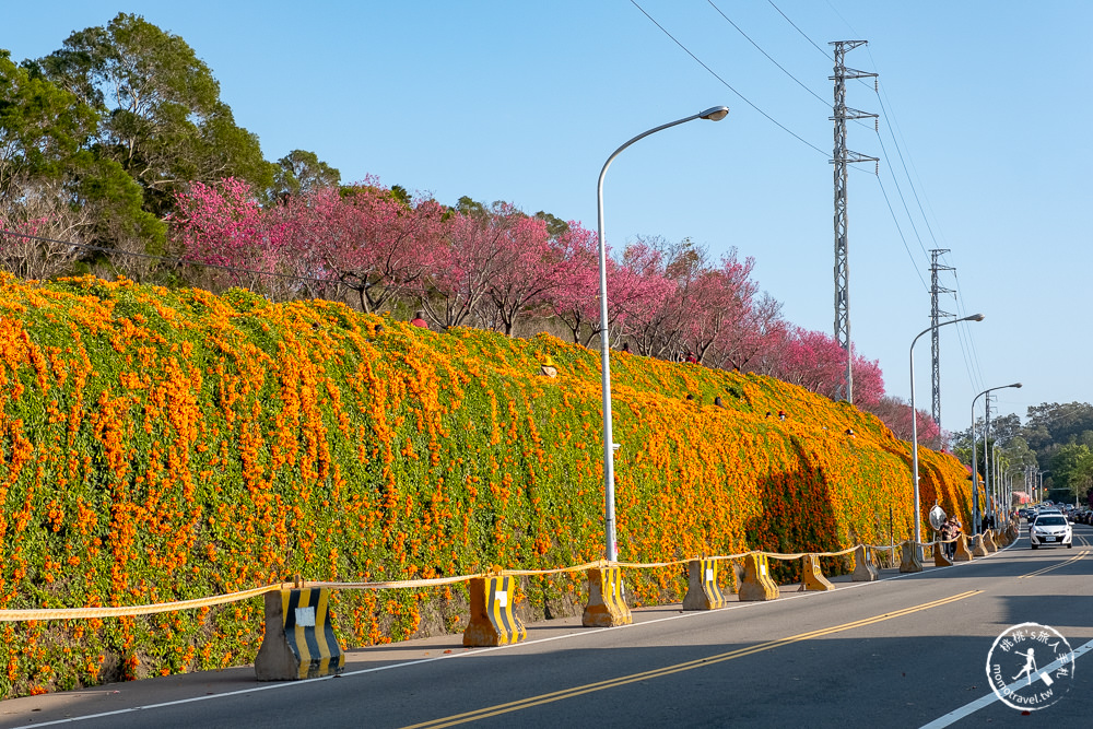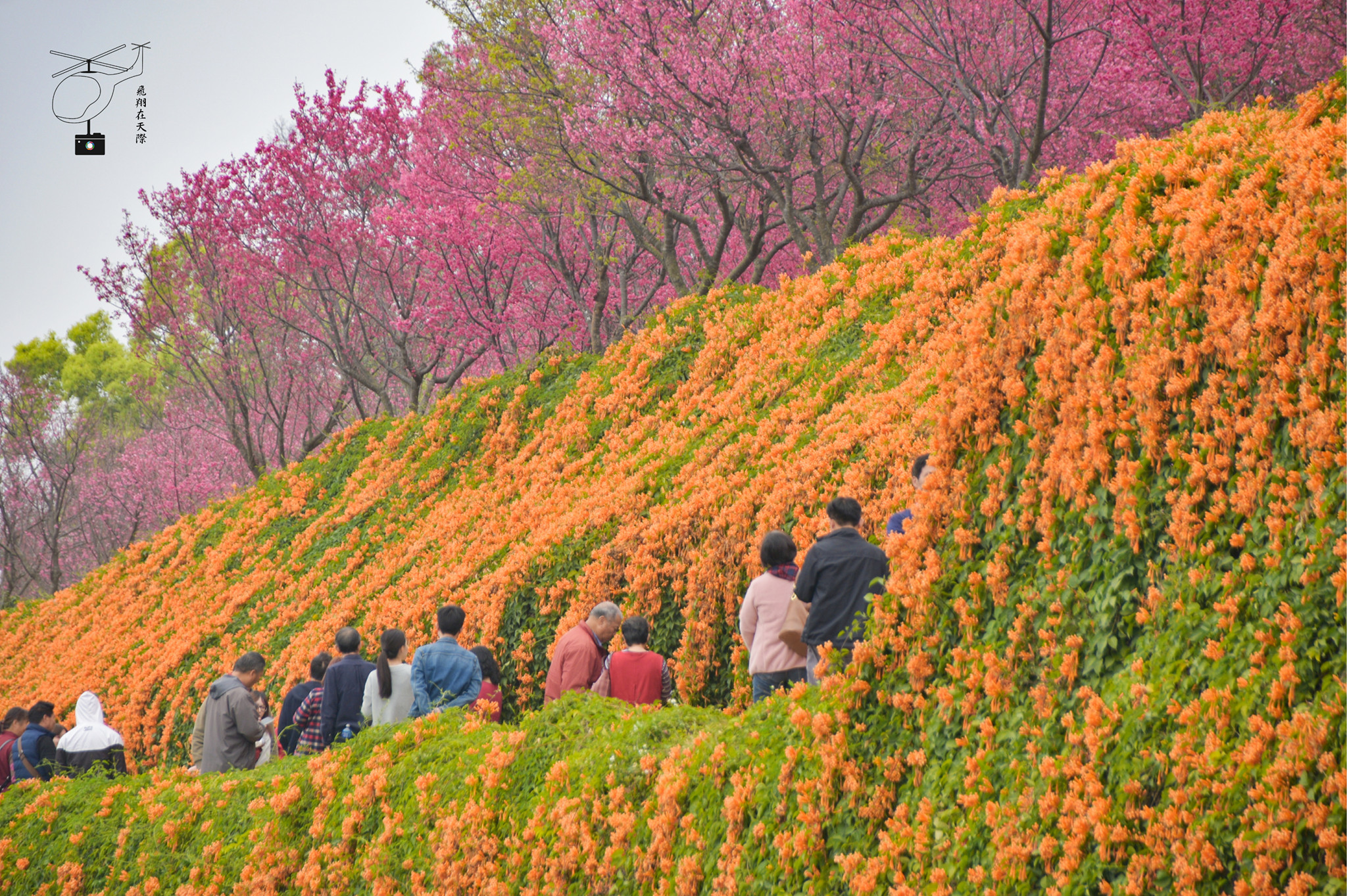 每年從2月中開始就可以看到一整片橘橙橙被炮仗花佈滿的美景,一直持續到3月中都能欣賞到。